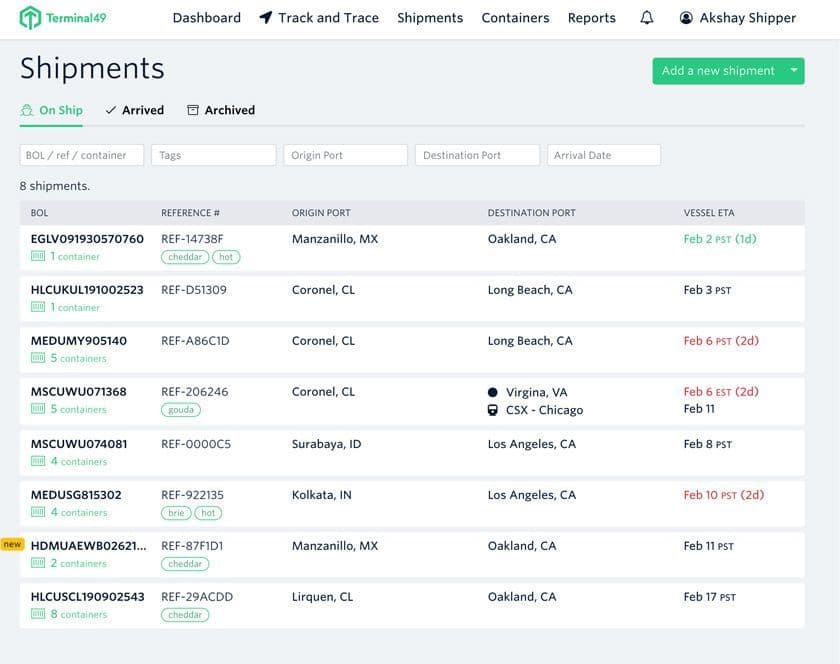 Information aggregation services like Terminal-49 make it easy to instantly identify where your containers are, anywhere in the world, at any moment. The Terminal49 dashboard puts all of your container information in one spot – eliminating the need to log onto multiple tracking applications.