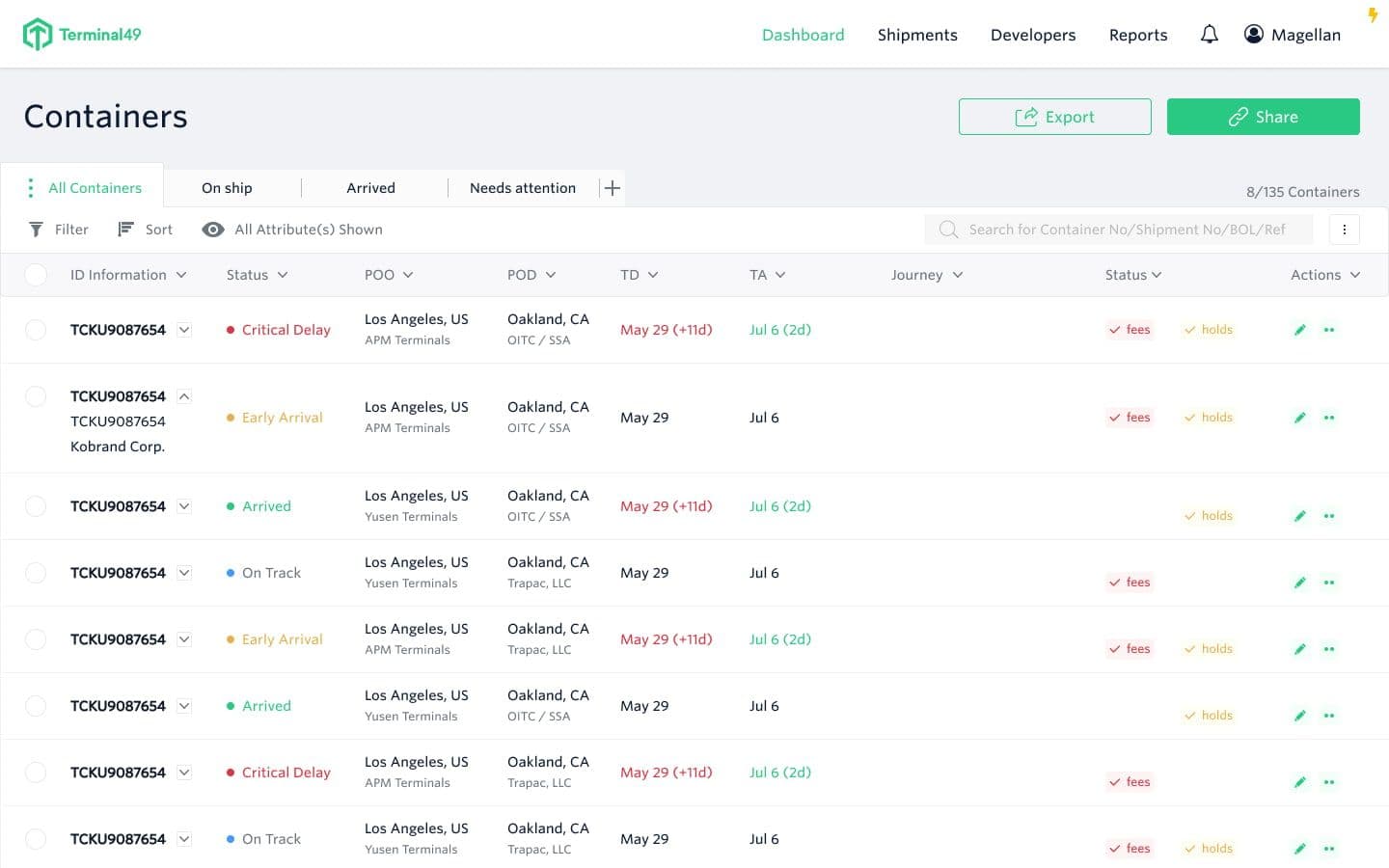 This is where we can help. Terminal49 automates all container tracking and provides instant access to up-to-date container statuses, helping companies more quickly identify containers at risk and make cost-saving decisions faster. Customers can view all milestones in a shipment's journey, from the empty container at the point of origin all the way to the empty container returned at the destination. All information is pulled directly from the steamship lines and terminals, standardized and formatted nearly for easy consumption. This data is available through their Terminal49 dashboard, or they can leverage our API to push container data into their own system of record.