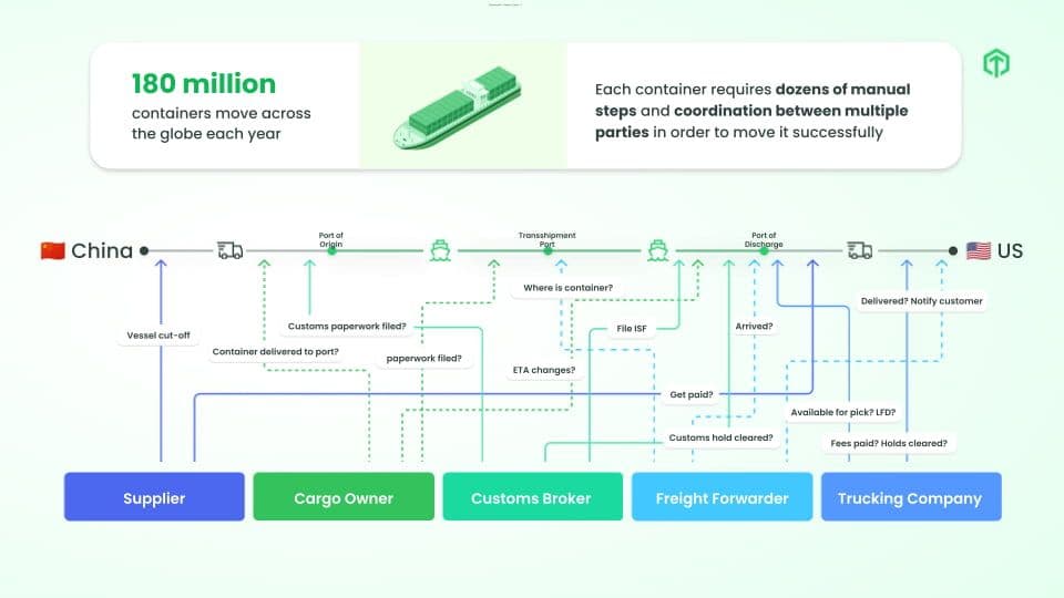 It’s incredibly tedious and cumbersome to keep track of shipping containers and coordinate all the steps in a container's journey. Everyone involved in the supply chain - suppliers, cargo owners, customs brokers, freight forwarders, trucking companies - relies on often-outdated milestone updates that they seek across dozens of steamship lines and terminal websites. These updates are then entered manually in spreadsheets and relayed to partners, customers, and coworkers for handoffs and coordination. Human dependency means this process is prone to human error. These errors can cause thousands of dollars in fees - demurrage, per diem, etc. - and can be detrimental to a company’s reputation.